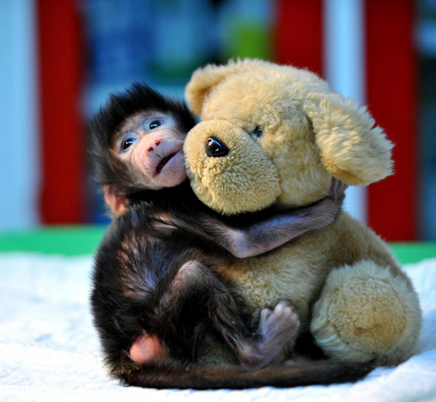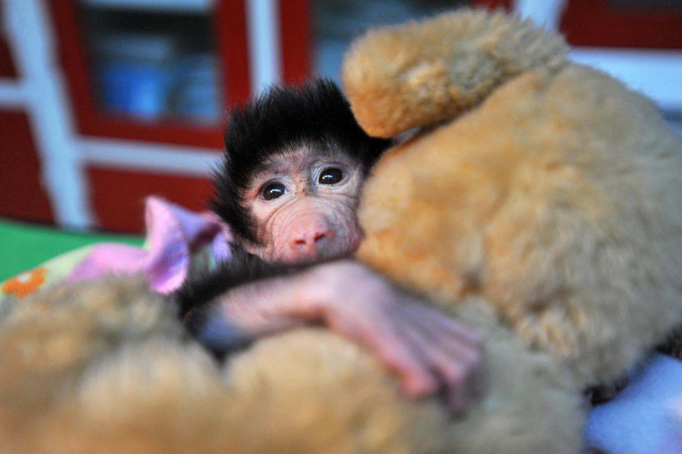 Turchia, Babbuino adottato da una famiglia A newborn baboon cuddles a teddy bear at Gaziantep Zoo after its mom refused to have her at Gaziantep Zoo, in Gazitantep, Turkey Gaziantep Zoo clinic chief and mother-of-two Ozsun Yurt Gunes (not seen) takes care of the newborn baby at her home after she finishes her shifts at the Zoo. Photo: Kerem Kocalar / kod 10611 Scanpix LaPresse -- Only Italy
