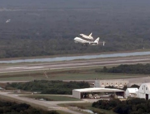This framegrab image provided by NASA TV shows space shuttle Endeavour atop NASA's Shuttle Carrier Aircraft, or SCA, at the Shuttle Landing Facility in the early morning hours at NASA's Kennedy Space Center on Wednesday, Sept. 19, 2012 in Cape Canaveral, Fla. The SCA, a modified 747 jetliner, will fly Endeavour to Los Angeles where it will be placed on public display at the California Science Center. This is the final ferry flight scheduled in the Space Shuttle Program era. (AP Photo/NASA-TV)