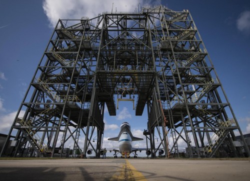Space shuttle Endeavour, mated atop NASA's Shuttle Carrier Aircraft, is moved back into the Shuttle Mate-Demate Device (MDD) at the NASA Kennedy Space Center, Shuttle Landing Facility, on Tuesday, Sept. 18, 2012 in Cape Canaveral, Fla. The SCA, a modified 747 jetliner, will fly Endeavour to Los Angeles where it will be placed on public display at the California Science Center. This is the final ferry flight scheduled in the Space Shuttle Program era. (AP Photo/NASA, Bill Ingalls)