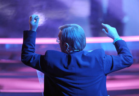 Lucio Dalla sul palco del teatro Ariston durante la prima serata del festival di Sanremo, in gara con la canzone ''Nani''' cantata insieme a Pierdavide Carone, foto di archivio del 14 febbraio 2012. ANSA /CLAUDIO ONORATI