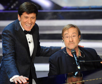 Gianni Morandi con Lucio Dalla sul palco del teatro Ariston durante la terza serata del festival di Sanremo, 16 febbraio 2012. ANSA /CLAUDIO ONORATI