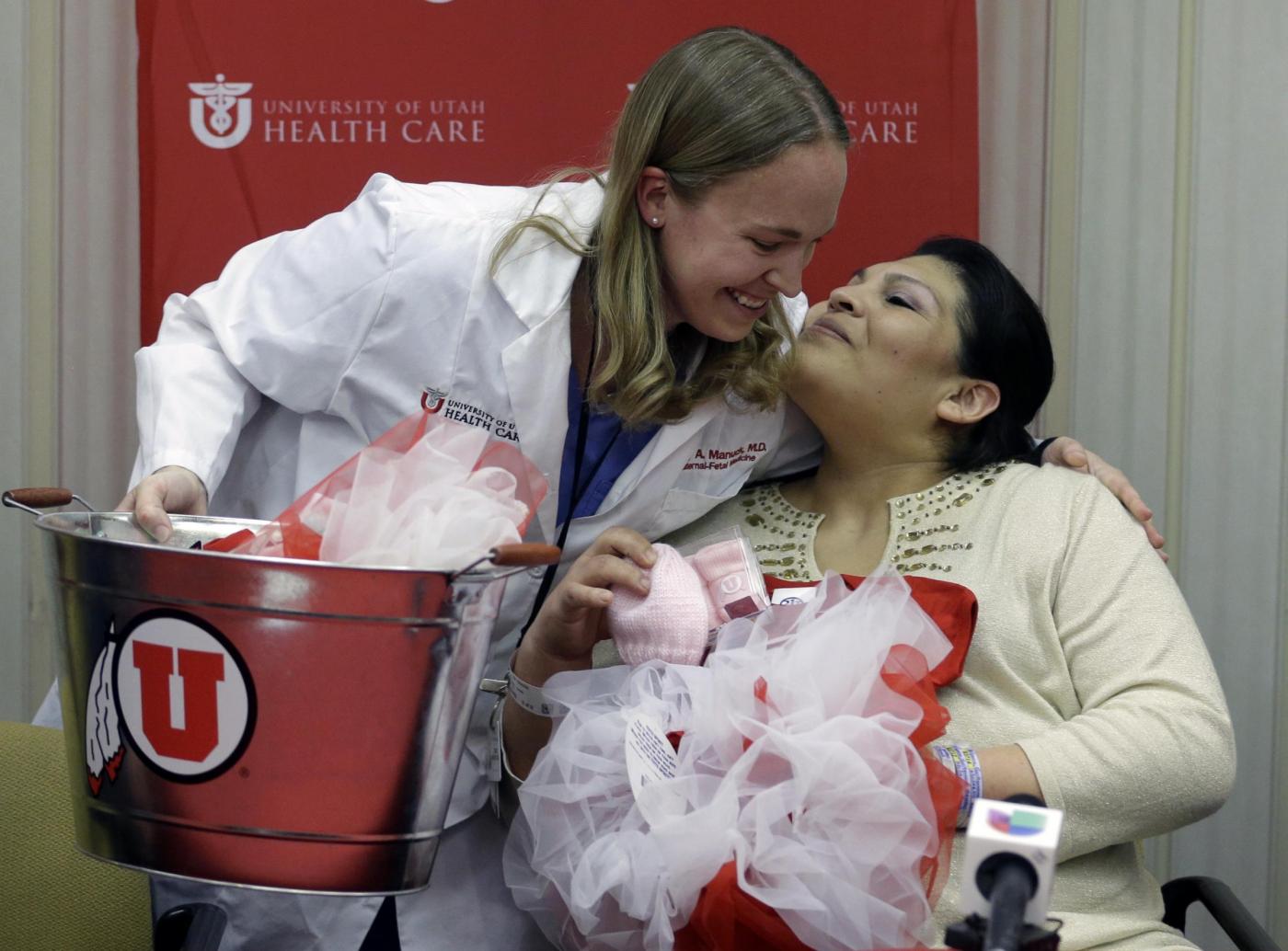 Dr. Tracy Manuck, left, receives a hug from Guillermina Garcia after getting a baby present following a news conference Tuesday, May 28, 2013, at the University of Utah hospital, in Salt Lake City. A team about 40 medical personnel led by eight doctors helped ensure a Utah couple's newborn quintuplets were born healthy. Guillermina and Fernando Garcia welcomed their five babies — three girls and two boys — over the weekend at the University of Utah hospital in Salt Lake City. (AP Photo/Rick Bowmer)