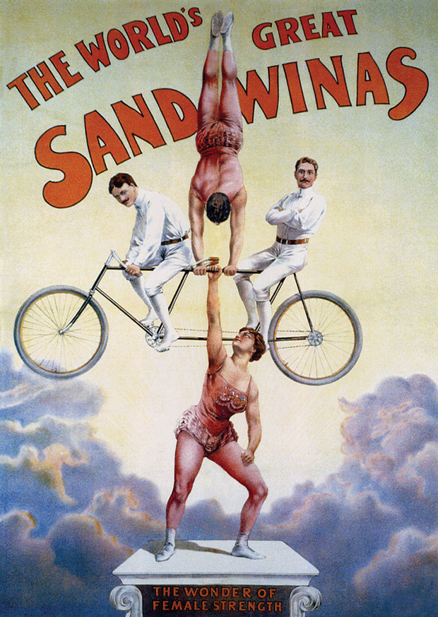 La strongwoman più forte e famosa dell'epoca d'oro del primo Novecento era Sandwina. Rimase oltre sei metri di altezza e aveva abbastanza massa muscolare da stupire il pubblico con la sua abilità. In questo pubblicità del 1900, alza tre persone (probabilmente i suoi fratelli) su una bicicletta.venus with biceps