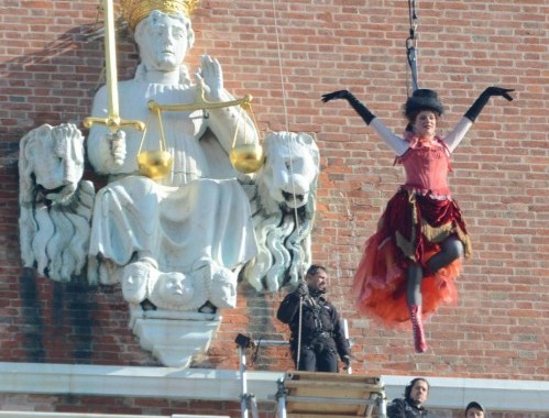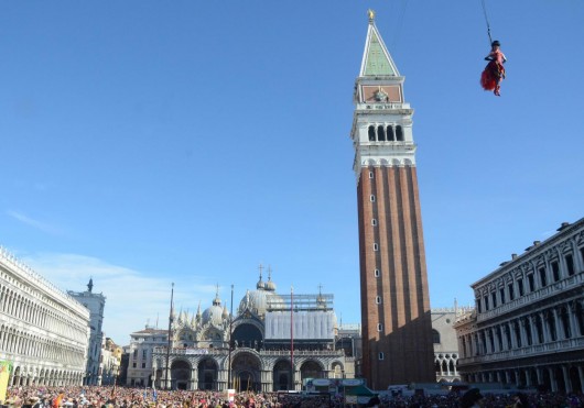VENEZIA – In una Piazza San Marco finalmente assolata, circa 70mila persone hanno assistito al “Volo dell’Angelo” dal campanile avvenuto domenica 3 febbraio verso le 19,50. L’evento, tradizionalmente dà il via al Carnevale di Venezia. Ad aprire la festa è stata l’emozionante discesa della ventenne Marta Finotto, studentessa veneziana, fasciata in un abito rosso e bianco intitolato ‘Mulin Rouge’.