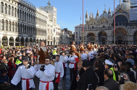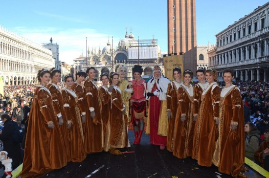 Assicurata ad una corda metallica la giovane ha ‘volato’ dalla cella campanaria fino al Gran Teatro allestito in Piazza San Marco, per l’entusiasmo dei turisti. Qui è stata accolta dalle maschere che interpretano il Doge e i nobili della Serenissima, attorniati dalle 12 ‘Marie’ del Carnevale, rievocazione che ricorda le dodici bellissime, umili fanciulle veneziane alle quali il Doge portava in dote gioielli per il loro matrimonio. Il ‘corteo delle Marie’, che in genere precede di un giorno il Volo dell’Angelo, era stato spostato a domenica a causa del maltempo che sabato 2 si era accanito su Venezia.