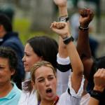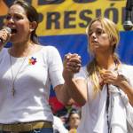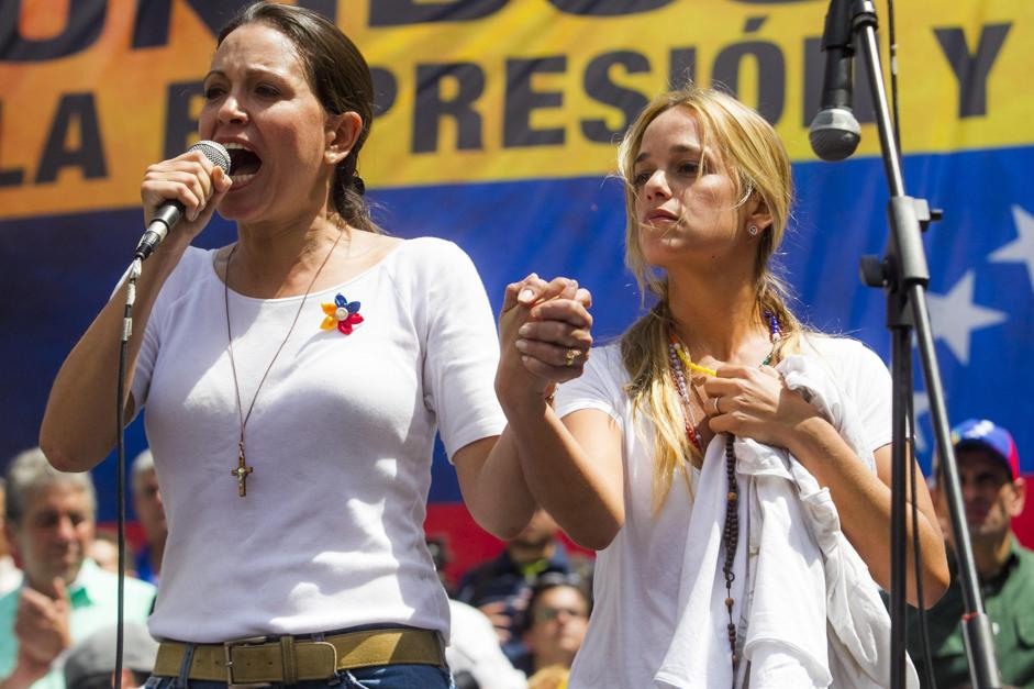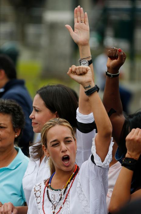 ApLilian Tintori, front, wife of jailed opposition leader Leopoldo Lopez , front, and congresswoman Maria Corina Machado, behind, shout slogans at a news conference in Plaza Venezuela in Caracas, Venezuela, Monday, Feb. 24, 2014. Tintori said her husband Lopez believes the time is not right for members of the opposition to sit down with Venezuela's President Nicolas Maduro. Lopez "thinks that Venezuela is not going to stop, that the discontent is nationwide, that it is a little late to call for peace," she said. The news conference was called to announce a march on Wednesday by opposition women. (AP Photo/Fernando Llano)