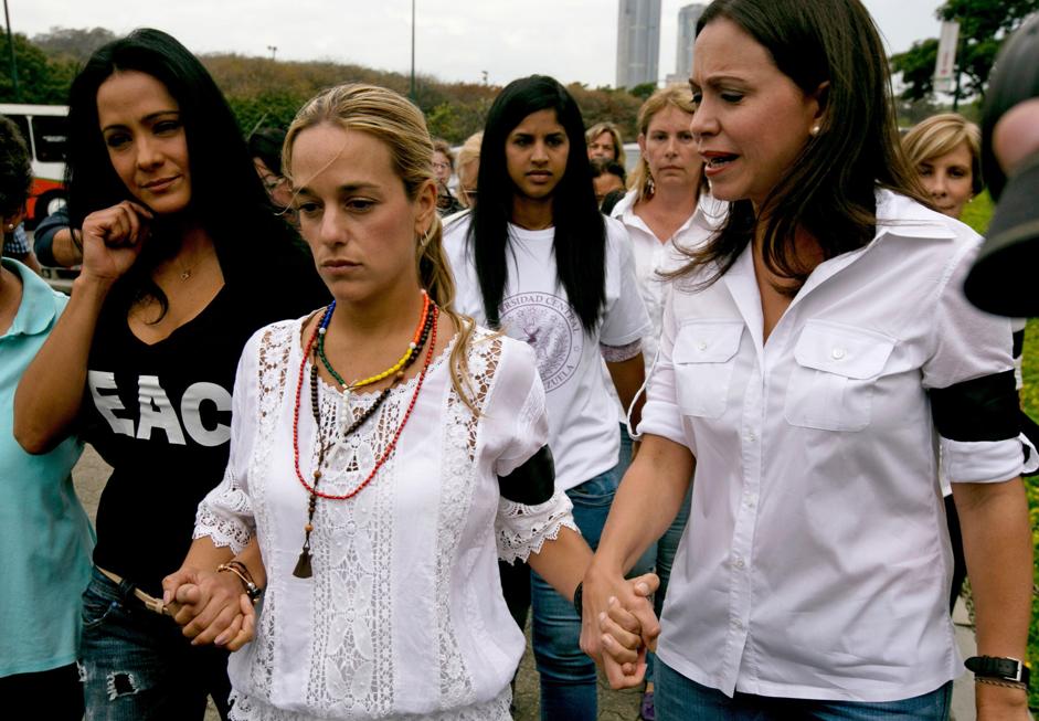 ApLilian Tintori, the wife of jailed opposition leader Leopoldo Lopez, center, walks hand in hand with actress Norkys Batista, left, and congresswoman Maria Corina Machado as they arrive for a news conference at Plaza Venezuela in Caracas, Venezuela, Monday, Feb. 24, 2014. Tintori said her husband Lopez believes the time is not right for members of the opposition to sit down with Venezuela's President Nicolas Maduro. Lopez "thinks that Venezuela is not going to stop, that the discontent is nationwide, that it is a little late to call for peace," she said. The news conference was called to announce a march on Wednesday by opposition women. (AP Photo/Fernando Llano)