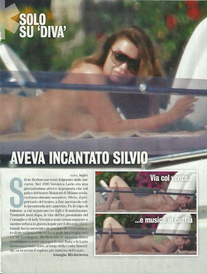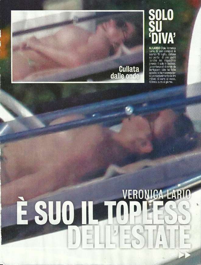 “L’ex moglie di Silvio Berlusconi, che ha appena compiuto 57 anni, prende il sole su uno yacht in completa libertà. Così non l’avete mai vista. Mentre infuria la guerra per il divorzio e il tribunale le ha riconosciuto un clamoroso assegno di mantenimento da 100 mila euro al giorno lei si gode una tregua estiva a poche settimane dalla condanna di primo grado dell’ex marito per il caso Ruby. E al largo della Costa Smeralda va in scena il topless più inaspettato”