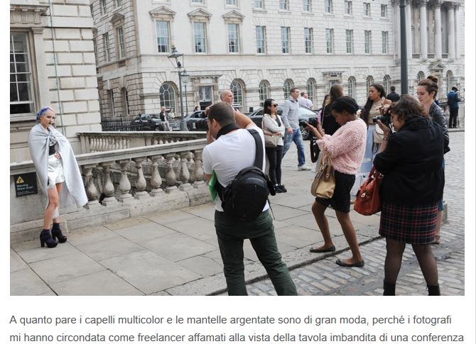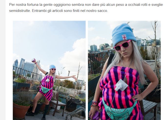 “In previsione della Settimana della Moda di Londra – scrive Hannah su VICE – ho steso un piano: un budget di 12 euro al giorno con cui acquistare l’outfit più imbecille che fossi riuscita a mettere insieme e l’obiettivo di essere fotografata da una delle sopracitate persone. La LFW è il più grande raduno di street style blogger del Regno Unito. Di conseguenza, le possibilità di finire al centro dell’obiettivo risultano triplicate al solo uscire di casa e posizionarsi nei pressi del primo frigo di Vitaminwater a disposizione. Se io, una ventiduenne che va in giro con accessori del Signore degli Anelli e braccialetti da festival, fossi riuscita a finire su un blog di moda, avrebbe potuto farlo chiunque”.