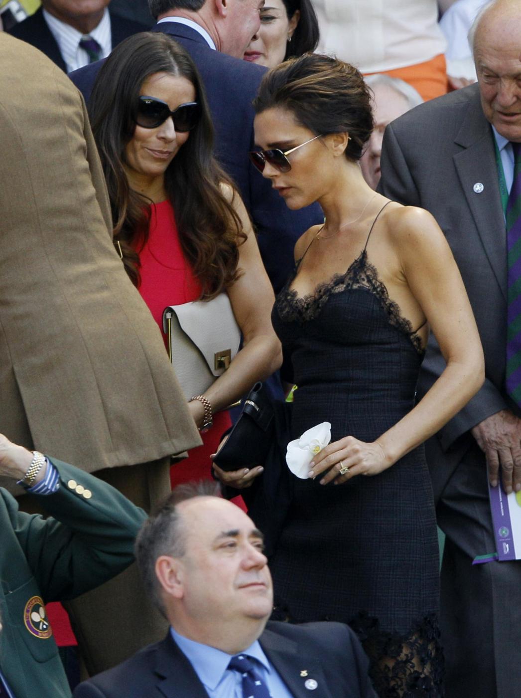 Designer Victoria Beckham, right, arrives to watch Andy Murray of Britain face Novak Djokovic of Serbia during the Men's singles final match at the All England Lawn Tennis Championships in Wimbledon, London, Sunday, July 7, 2013. (AP Photo/Kirsty Wigglesworth)