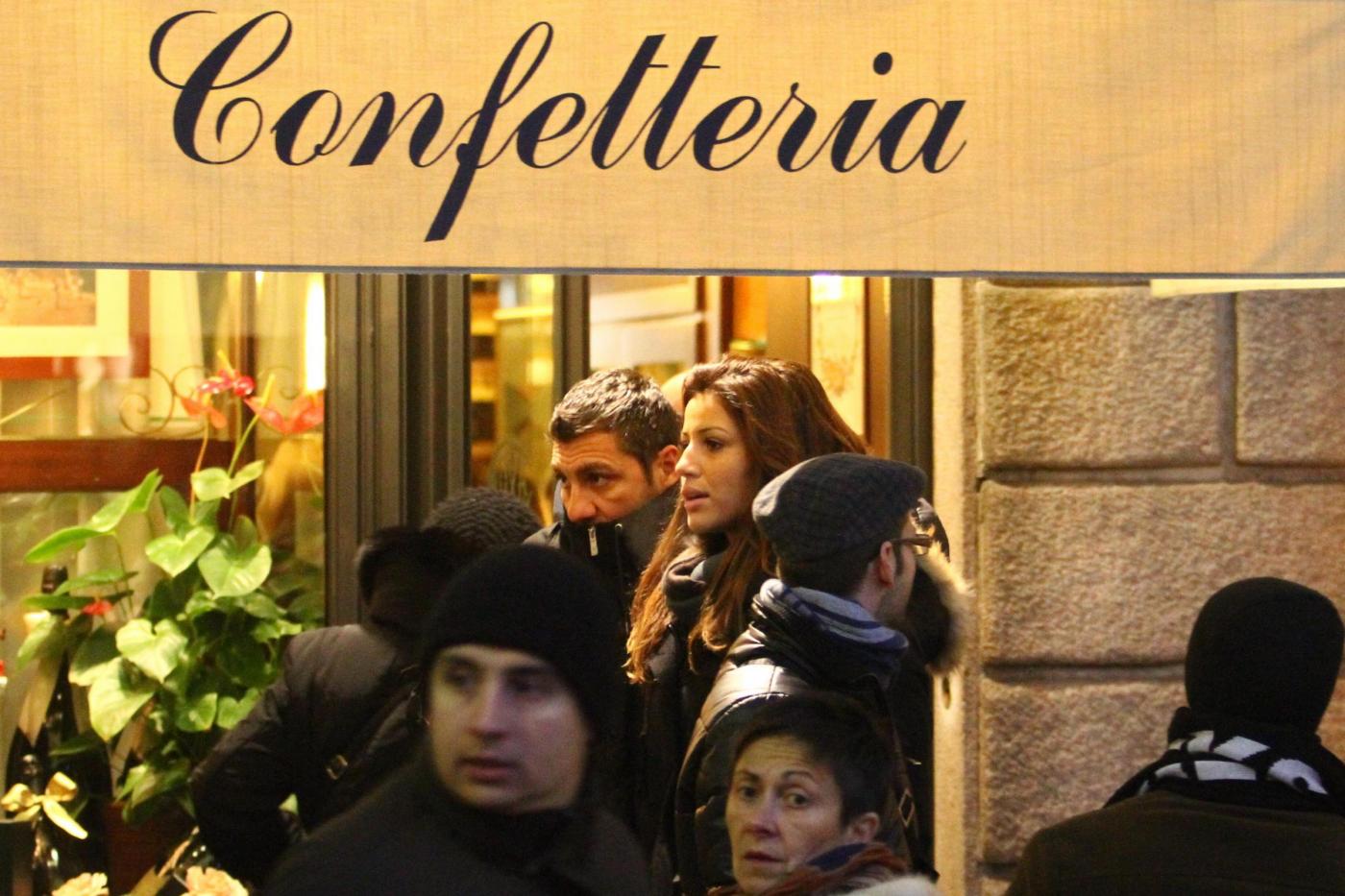 © Paolo Della Bella/LaPresse 08-12-12 Milano Gossip Christian Vieri e Nabila Chihab a passeggio nelle vie del centro,poi shopping da Dolce e Gabbana e in orologeria da Audemars Piguet prima di rilassarsi da Conti cafË Nella foto Christian Vieri e Nabila Chihab da Conti CafË © Paolo Della Bella /LaPresse 08-12-12 Milan Gossip Christian Vieri and Nabila Chihab a walk in the town center, then shopping at Dolce and Gabbana and watches from Audemars Piguet before relaxing by Conti cafË In the picture Christian Vieri and Nabila Chihab by Conti CafË