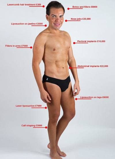 Tutto ha inizio intorno al 2004, con un intervento al naso. All’epoca Rodrigo decise di utilizzare una eredità per modificare quella parte del suo volto che aveva odiato fin da piccolo. A oggi, 10 anni dopo, il ragazzo ha speso circa 100 mila Sterline, oltre 120 mila euro, per 12 operazioni tra liposuzione, liposcultura dei pettorali e delle gambe e iniezioni di botulino.