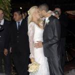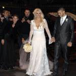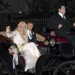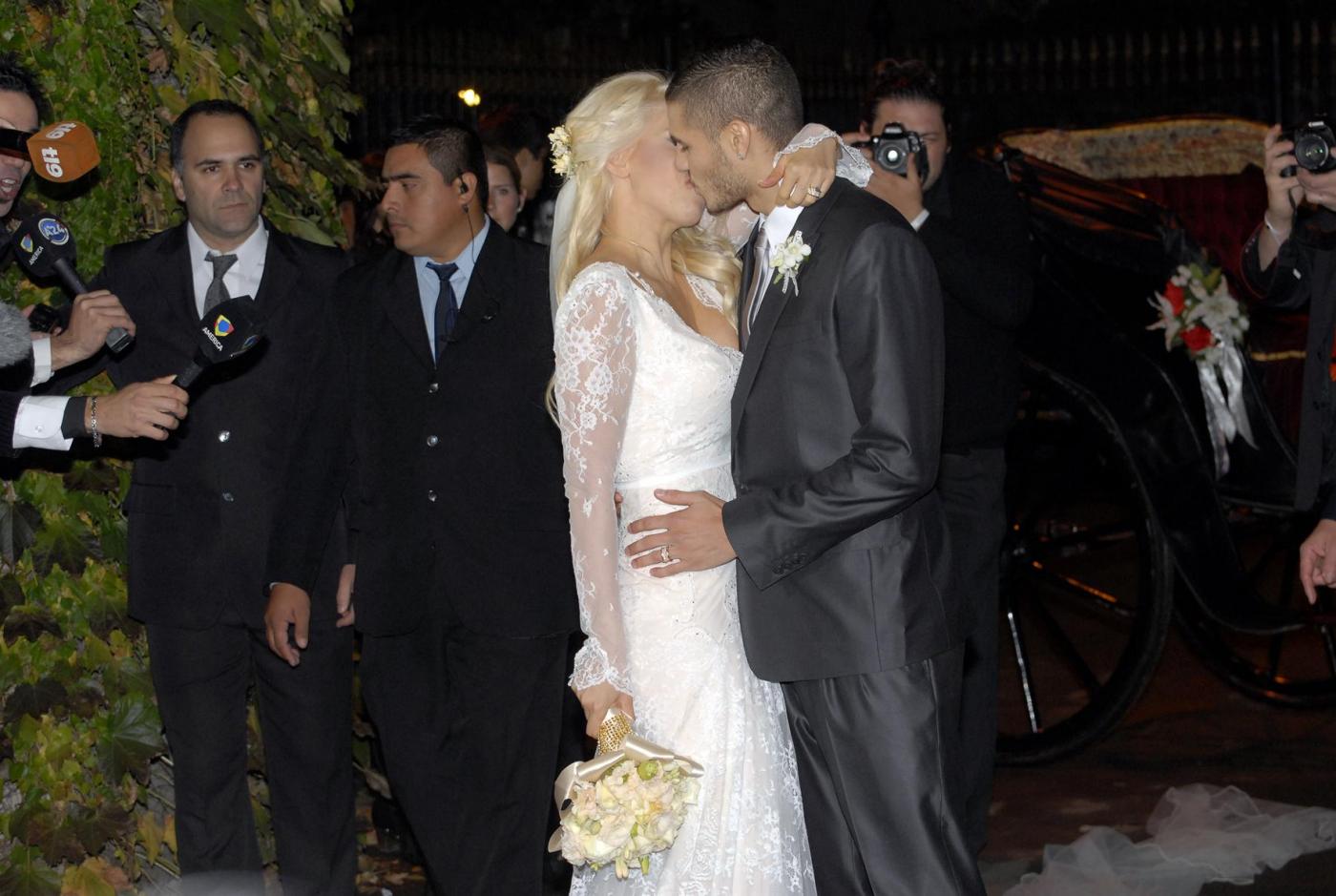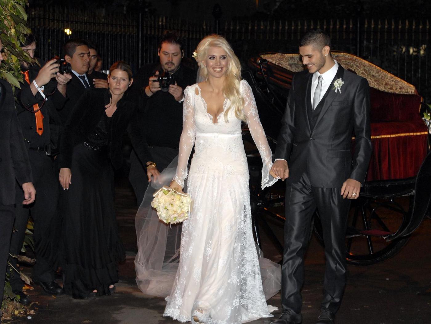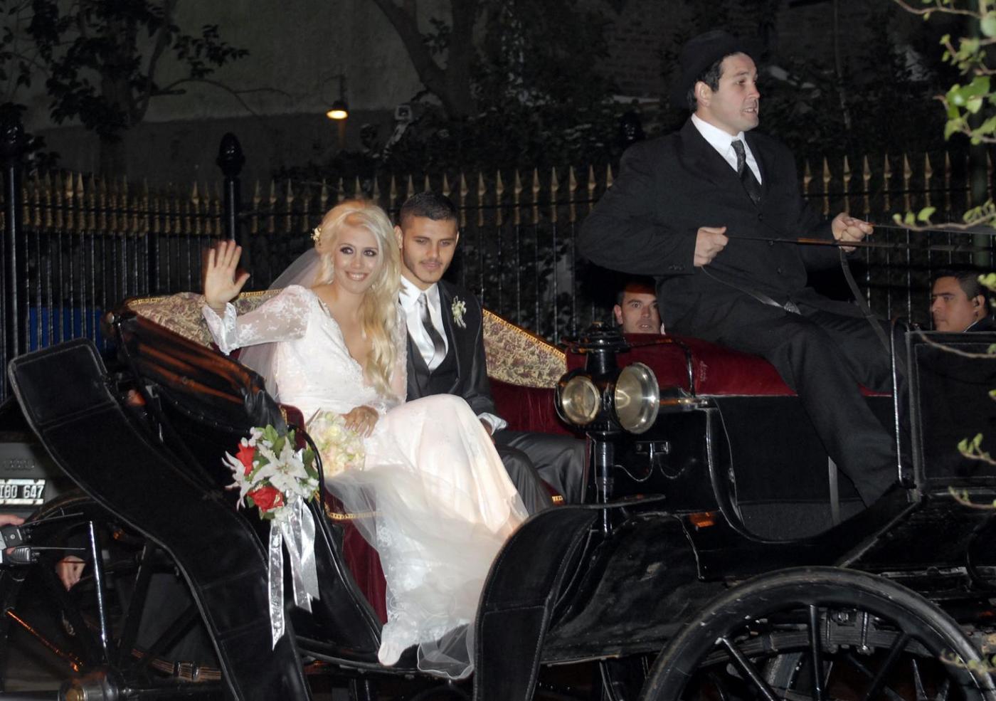 Gli sposi sono arrivati insieme in carrozza: lei in abito bianco lungo in pizzo, firmato Roberto Cavalli, lui in abito scuro, elegante. Wanda Nara ha sposato Icardi dopo un fidanzamento di pochi mesi e dopo solo 6 mesi dal divorzio: la legge argentina lo consente. (Foto Lapresse).