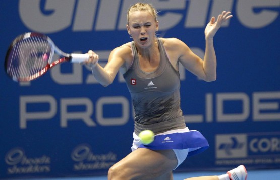 SAN PAOLO (BRASILE) – La tennista danese Caroline Wozniack, sul campo del”Gillette Federer Tour exhibition” imita la prestanza fisica dell’americana Serena Williams.