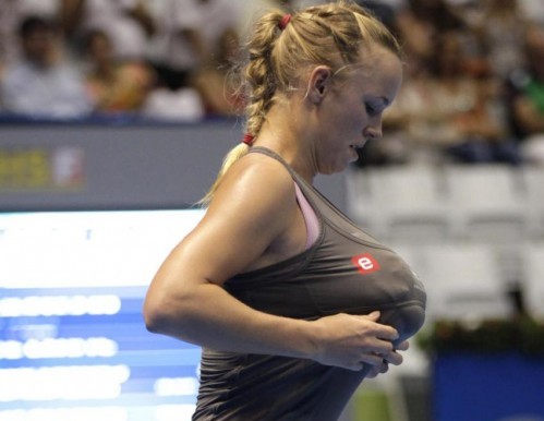 Denmark's Caroline Wozniacki jokingly wears towels under her clothes as she plays a Gillette Federer Tour exhibition tennis match with Russia's Maria Sharapova in Sao Paulo, Brazil, Friday, Dec. 7, 2012. Wozniacki mentioned during a press conference after the game that she was performing an impression of her friend and fellow tennis player Serena Williams. (AP Photo/Andre Penner)