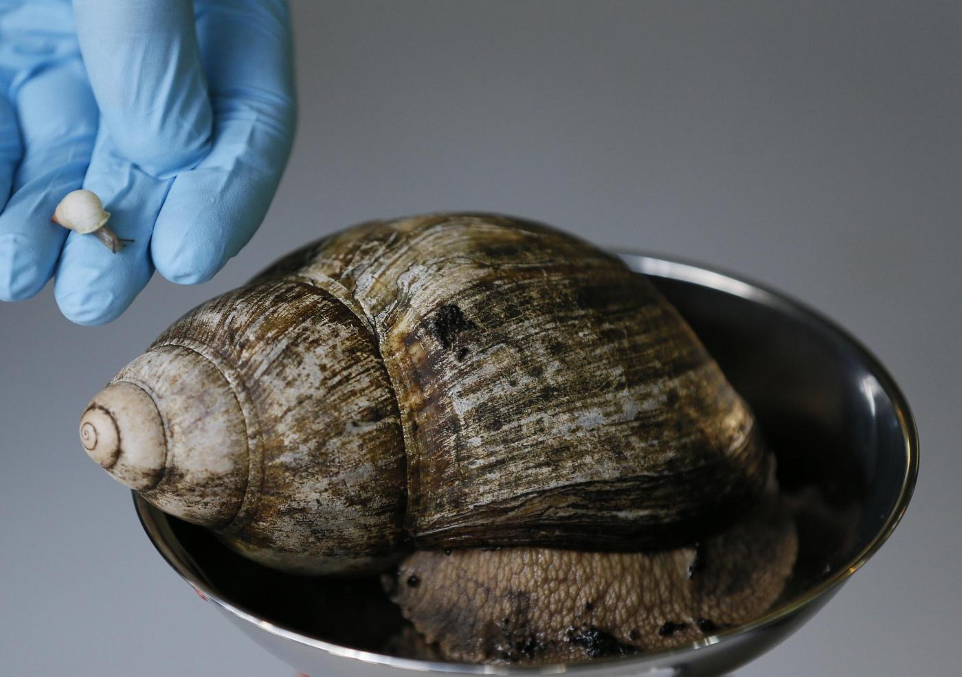 La lumaca Partula del Nord AmericaA rare Partula snail, left, is held next to an African Land snail whilst it is weighed during a photocall at London Zoo, Thursday, Aug. 21, 2014. The Zoo held it's annual weigh-in where the vital statistics of animals were taken in an aid for keepers to detect pregnancies and check the animals general wellbeing. (AP Photo/Kirsty Wigglesworth)
