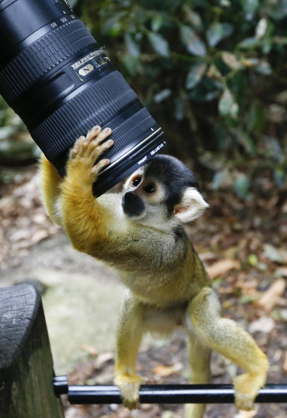 Una scimmia tipica del Centro e Sud America A squirrel monkey looks into a photographers lens during a photocall at London Zoo, Thursday, Aug. 21, 2014. The Zoo held it's annual weigh-in where the vital statistics of animals were taken in an aid for keepers to detect pregnancies and check the animals general wellbeing. (AP Photo/Kirsty Wigglesworth)