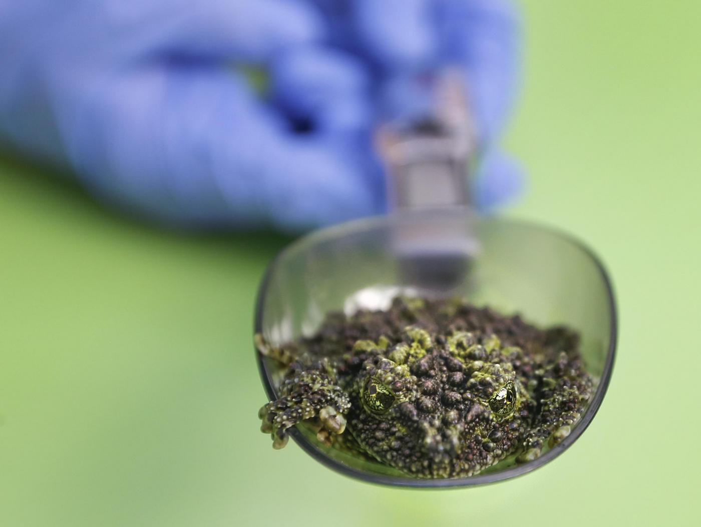 Una rana del Vietnam A mossy frog is weighed in a spoon during a photocall at London Zoo, Thursday, Aug. 21, 2014. The Zoo held it's annual weigh-in where the vital statistics of animals were taken in an aid for keepers to detect pregnancies and check the animals general wellbeing. (AP Photo/Kirsty Wigglesworth)