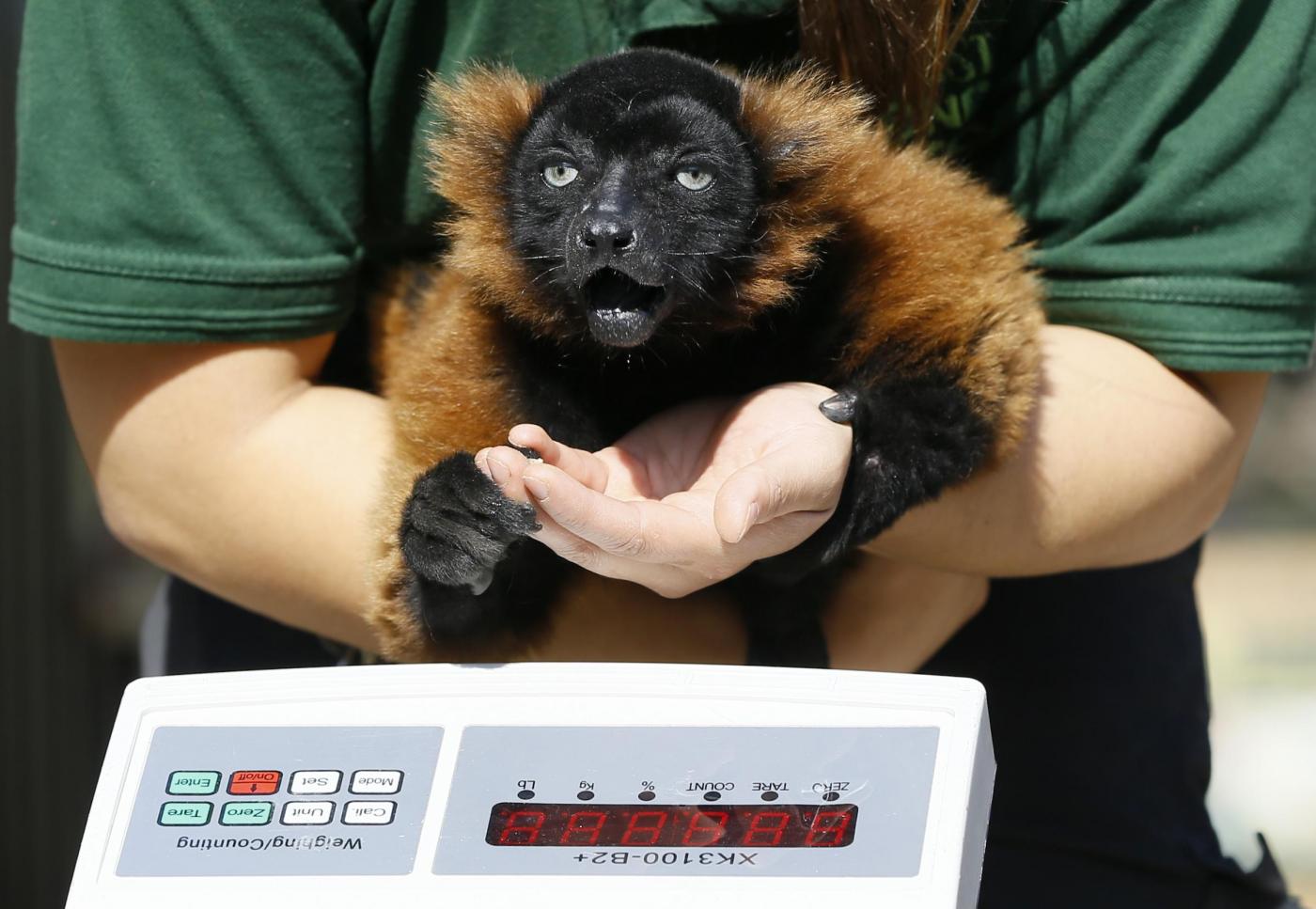 Il vari rosso, scimmia del MadagascarA keeper attempts to weigh Cid, a Red Ruffed Lemur during a photocall at London Zoo, Thursday, Aug. 21, 2014. The Zoo held it's annual weigh-in where the vital statistics of animals were taken in an aid for keepers to detect pregnancies and check the animals general wellbeing. (AP Photo/Kirsty Wigglesworth)