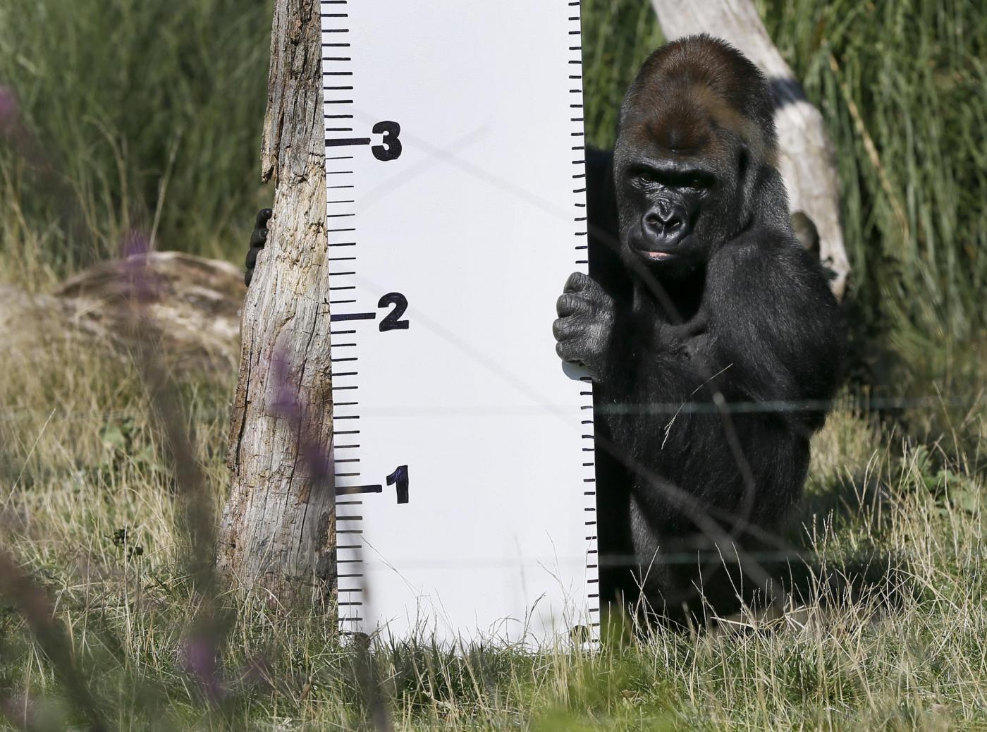 Il gorilla Kumbuka Kumbuka, a Silverback Western Lowland Gorilla sits next to a ruler during a photocall at London Zoo, Thursday, Aug. 21, 2014. The Zoo held it's annual weigh-in where the vital statistics of animals were taken in an aid for keepers to detect pregnancies and check the animals general wellbeing. (AP Photo/Kirsty Wigglesworth)