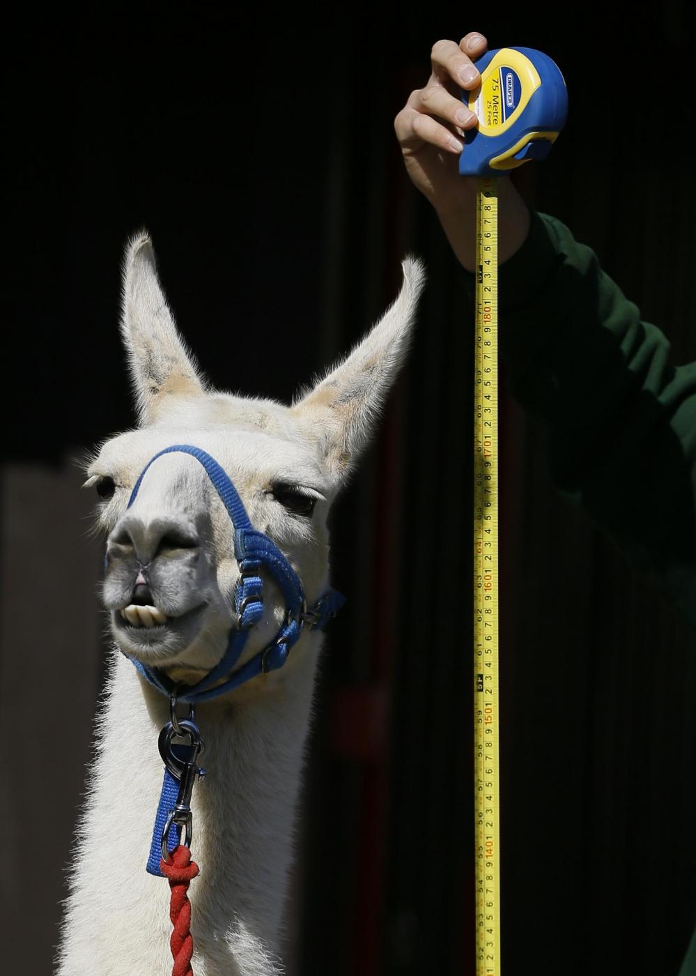 Il lama Perry A keeper measures Perry the Llama during a photocall at London Zoo, Thursday, Aug. 21, 2014. The Zoo held it's annual weigh-in where the vital statistics of animals were taken in an aid for keepers to detect pregnancies and check the animals general wellbeing. (AP Photo/Kirsty Wigglesworth)
