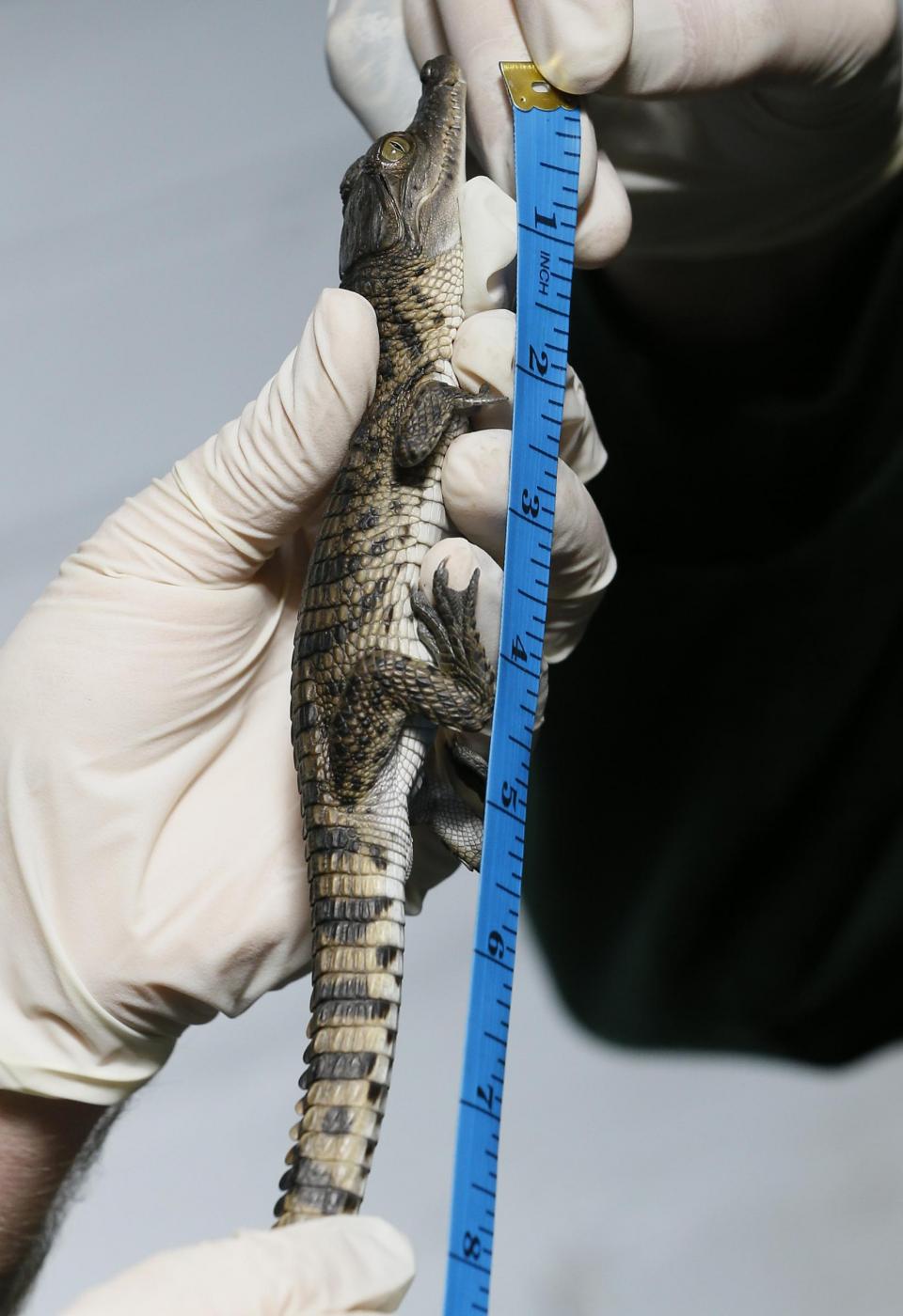 Un coccodrillo delle Filippine di 7 settimane A seven week old Philippine Crocodile is measured during a photocall at London Zoo, Thursday, Aug. 21, 2014. The Zoo held it's annual weigh-in where the vital statistics of animals were taken in an aid for keepers to detect pregnancies and check the animals general wellbeing. (AP Photo/Kirsty Wigglesworth)