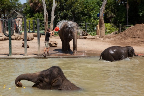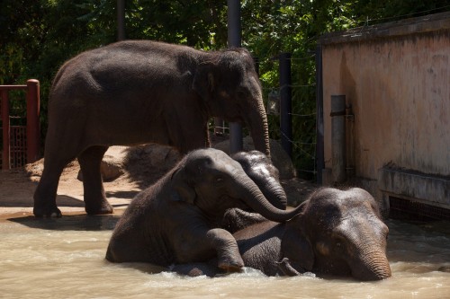 epa03489942 Pregnant Asian Elephant Num-Oi (D) floats in the pool alongside calf Mali and Ongard with Kulab, Ongard's mother (B) at Trail of the Elephants at Melbourne Zoo, Melbourne, Australia, 29 November 2012. Num-Oi is pregnant for the first time and due to give birth between late December and late January. She has gained 250kg during her pregnancy. EPA/PAUL JEFFERS