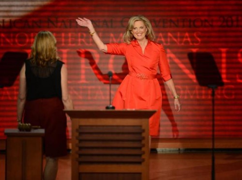 epa03373160 Ann Romney, wife of Republican Presidential nominee Mitt Romney, greets the delegates gathered at the evening session of the Republican National Convention at the Tampa Bay Times Forum in Tampa, Florida, USA, 28 August 2012. Mitt Romney was officially nominated as the Republican presidential nominee for the 2012 US presidential election. EPA/SHAWN THEW