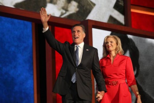 epa03373178 Republican Presidential Nominee Mitt Romney (L) and his wife Ann wave to delegates gathered at the evening session of the Republican National Convention at the Tampa Bay Times Forum in Tampa, Florida, USA, 28 August 2012. Mitt Romney was officially nominated as the Republican presidential nominee for the 2012 US presidential election. Romney joined his wife onstage after she addressed the convention delegates. EPA/JIM LO SCALZO