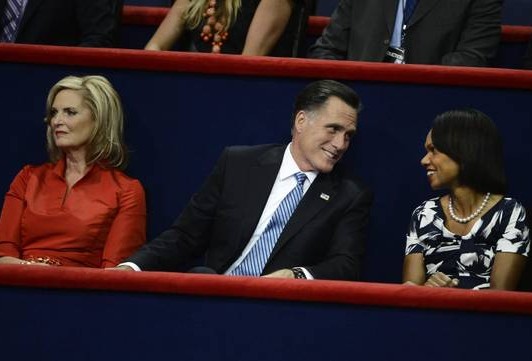 epa03373186 Republican Presidential Nominee Mitt Romney (C) speaks with former Secretary of State Condolezza Rice (R) at the evening session of the Republican National Convention at the Tampa Bay Times Forum in Tampa, Florida USA 28 August, 2012. Mitt Romney was officially nominated as the Republican presidential nominee for the 2012 US presidential election. Left is Romney's wife Ann. EPA/TANNEN MAURY