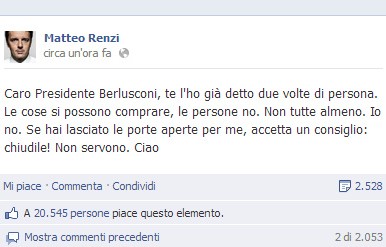 A scriverlo è Matteo Renzi su Facebook, in una sorta di risposta pubblica e piuttosto eloquente a seguito delle dichiarazioni di ieri di Silvio Berlusconi. Il Cavaliere ha infatti detto che per il sindaco di Firenze, che ha conteso la premiership a Bersani nelle primarie del centrosinistra, erano aperte le porte del Pdl.
