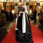 L’abito fa parte della collezione disegnata da Guillermo Mariotto, direttore creativo della maison Gattinoni, intitolata Le bottigliette. Infatti, la forma del vestito, dicono dalla maison, trae ispirazione da una piccola bottiglia che si frantuma in mille pezzi. L’abito nero ha un corsetto stretto che sottolinea il punto di vita sottile della sindaca e la gonna ampia per via della crinolina, doppiata in tulle, è intarsiata in velluto per un effetto vintage, reso ancora più evidente dai decori di paillettes e micro-cannette. La stola fu disegnata da Fernanda Gattinoni per la diva Anna Magnani.