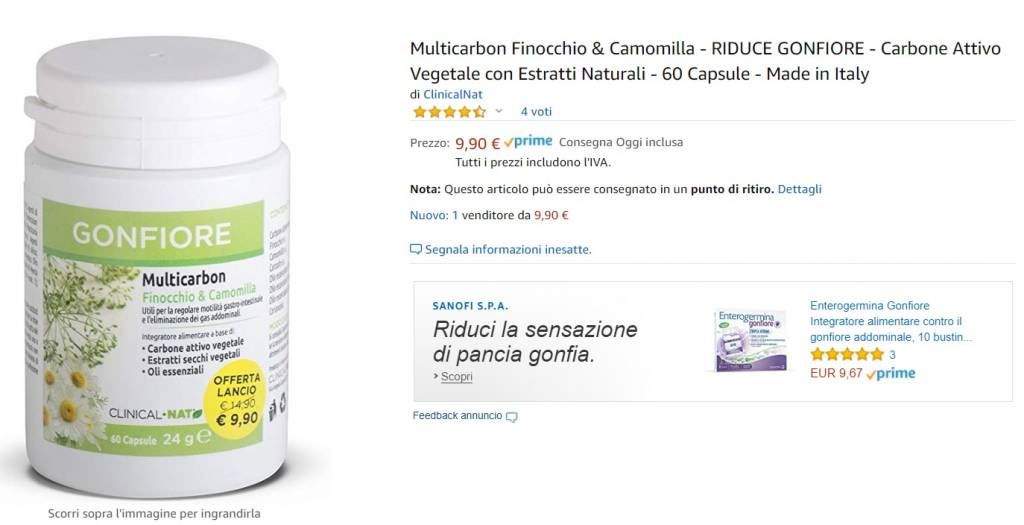 Capsule, integratore di finocchio e camomilla. Riduce il gonfiore. Carbone attivo vegetale con estratti naturali, 9.90 euro.