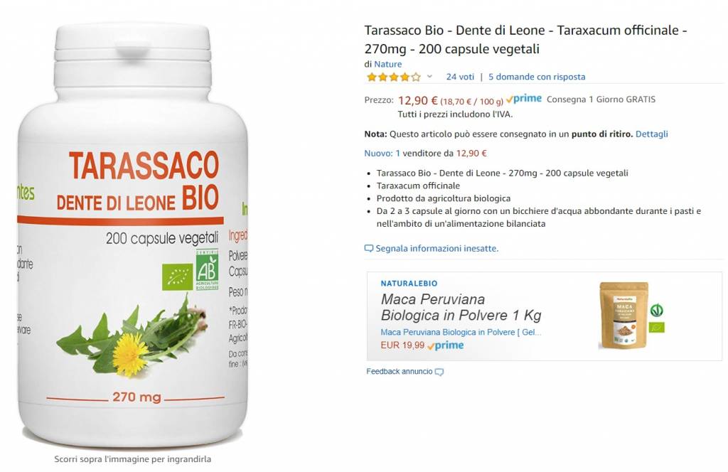 Capsule di Tarassaco Bio. 200 capsule da 270mg. Prodotto da agricoltura biologica, 13 euro.