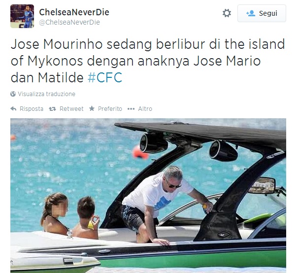 MYKONOS (GRECIA) – José Mourinho ha scelto l’isola di Mykonos per trascorrere una breve vacanza. Lontano dall’immagine di uomo duro e severo a cui siamo abituati, l’allenatore del Chelsea si è mostrato un padre attento e affettuoso con i suoi due figli, Matilda, 17 anni, nota come “Tita” e Joseph, 14 anni, soprannome: “Zuca”. Assente invece la moglie, Matilde Faria, conosciuta per essere non solo la sua compagna di vita, ma anche la sua prima confidente nei momenti di maggiore necessità e difficoltà.