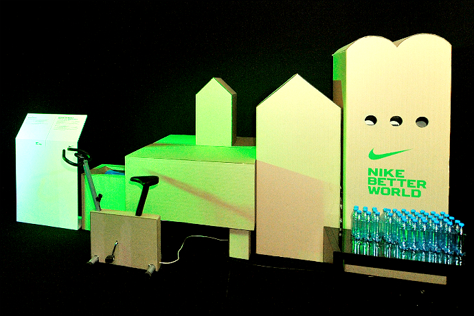 Forse l’idea più originale è stato di Nemat Alireza che ha posto l’accento sulla gestione del prodotto Nike. L’installazione di Nemat è costituito da materiali naturali e plastica riciclata.