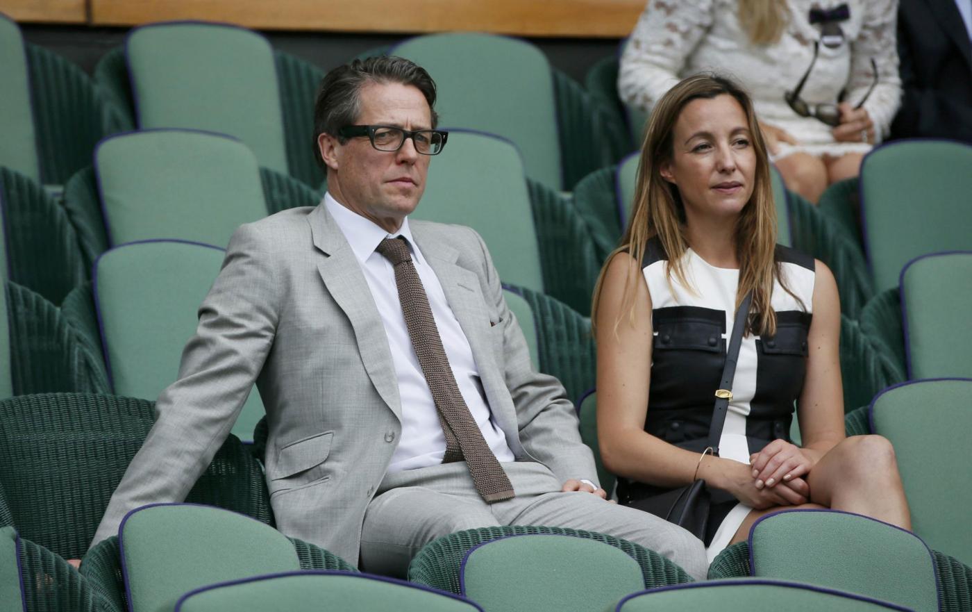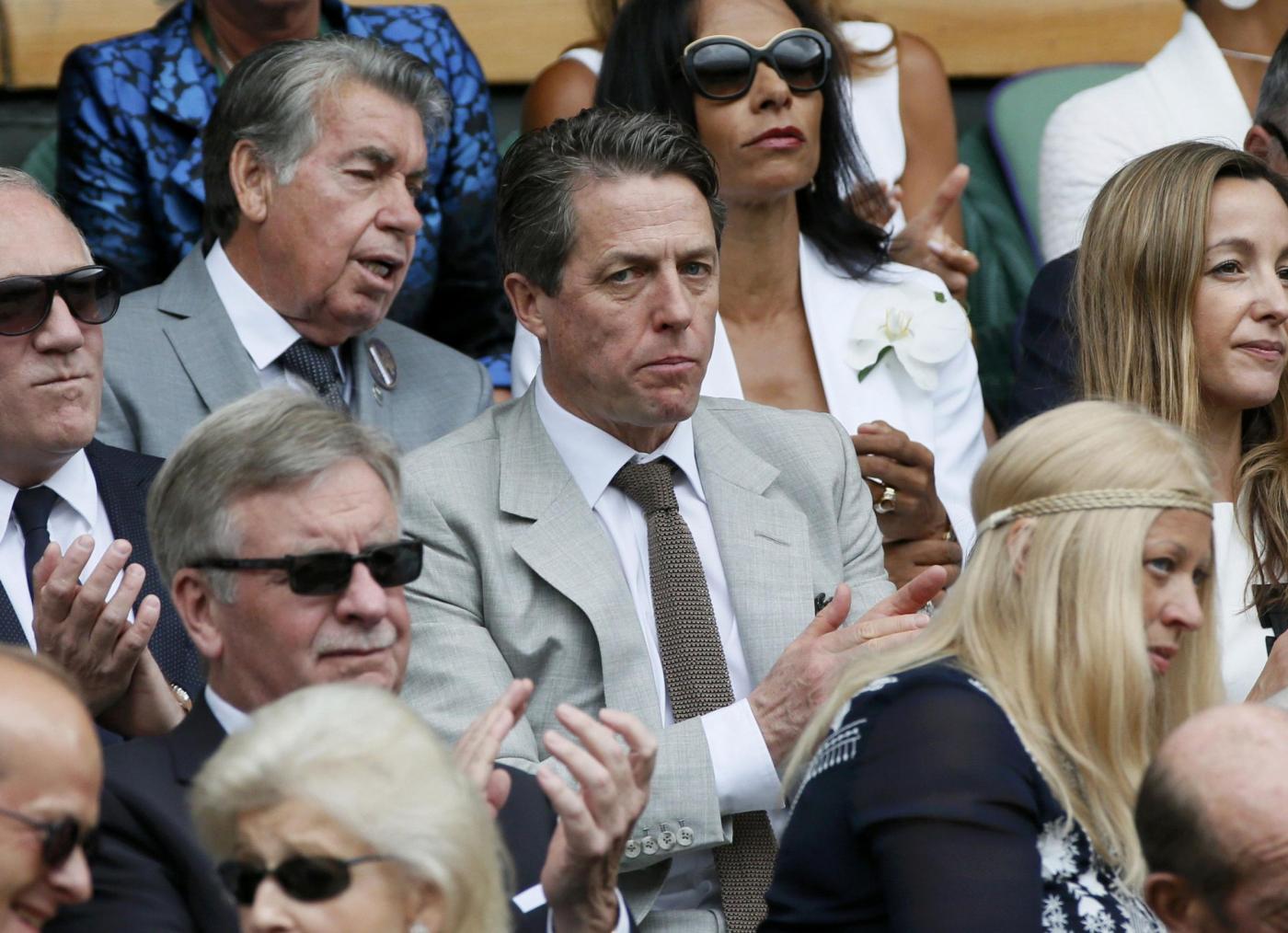 Actor Hugh Grant on Centre Court at the Wimbledon Tennis Championships in London, July 12, 2015. REUTERS/Stefan Wermuth