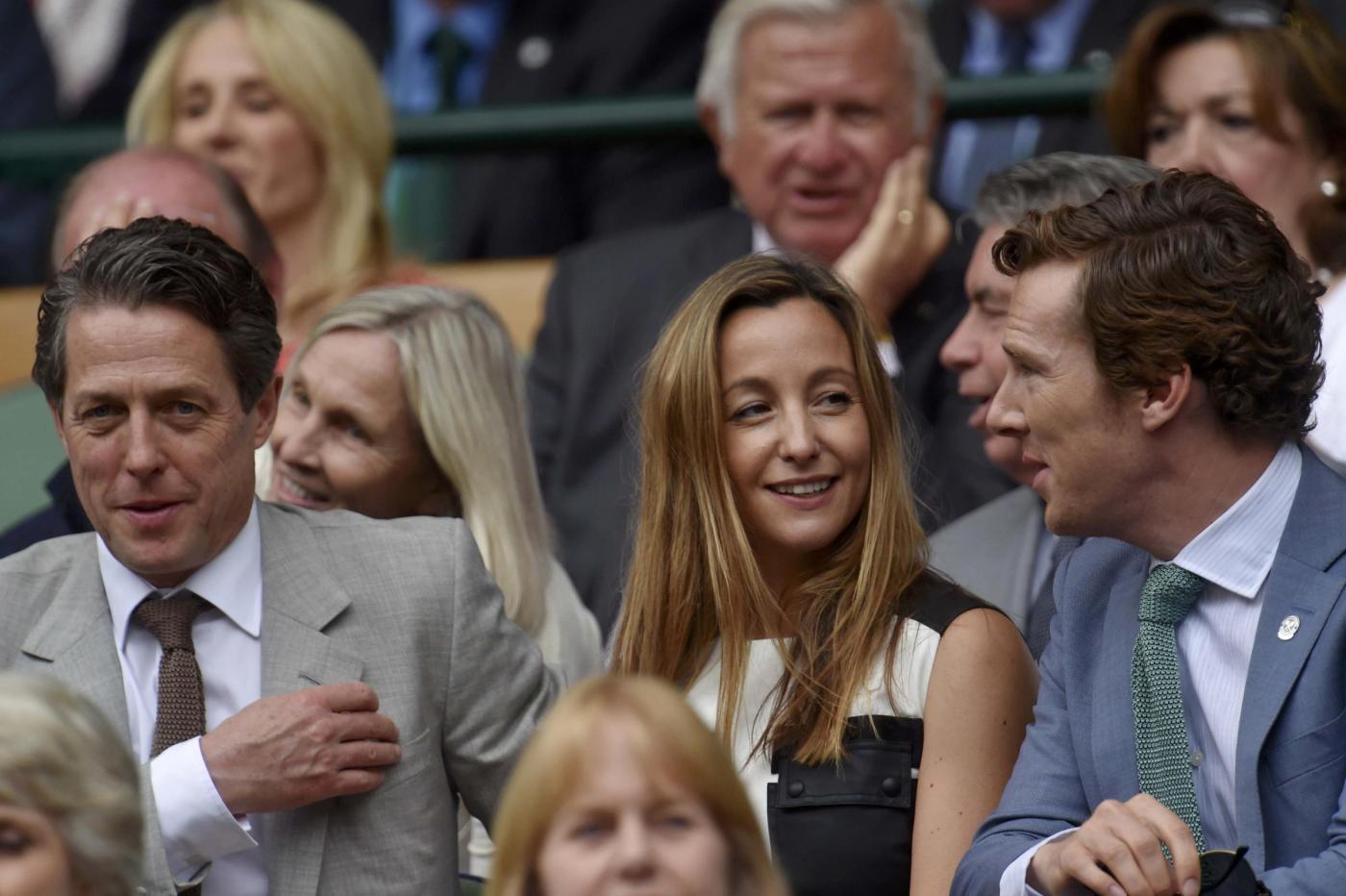 Actor's Benedict Cumberbatch (R) and Hugh Grant (L) on Centre Court at the Wimbledon Tennis Championships in London, July 12, 2015. REUTERS/Toby Melville