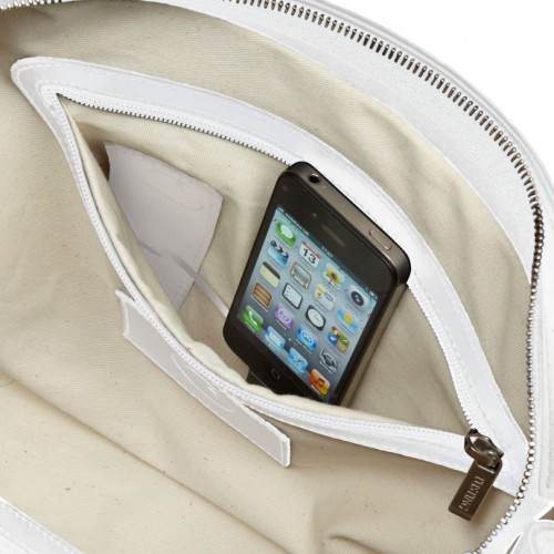 Che particolarità possiede questa bellissima borsa, proposta in passerella nel colore bianco? Detto fatto, la borsa è dotata niente meno che… di un caricabatterie per il Blackberry, iPhone e Android.