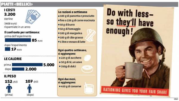 “Un menù da Seconda Guerra Mondiale, quando ai militari sul fronte veniva rifilata la mitica «razione k» e ai civili veniva concessa una busta della spesa con pochi – ma nutrienti – «cibi basici». «Basici» per la linea ma anche per il bilancio familiare: con questo sistema Carolyn ha risparmiato in un anno 3200 sterline. Sarà stato l’effetto psicologico, fatto sta che la bilancia è passata da segnare un 152 chili da XXXL a indicare un più dignitoso 107 chili da XL. Zavorra eliminata in un anno: ben 45 chili. Per quanto riguarda ingredienti e razioni settimanali troverete tutto nel grafico qui sopra. Ritagliatelo e mettetelo nel portafoglio. Se non riuscire a snellirvi, avrete almeno risparmiato qualche euro”