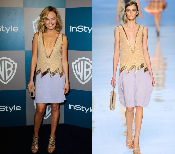 Sulla passerella invece il colore pastello è al centro dell’attenzione, che sottolinea in maniera forse eccessiva la carnagione chiarissima della modella. La scollatura del vestito scende molto più giù rispetto a quella di Malin Akerman, il cui seno è un po’ più prosperoso.
