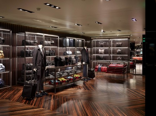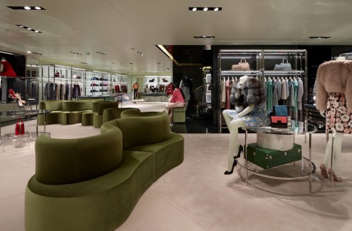Di grande impatto l’area riservata al Made-to-Measure che si distingue per l’utilizzo di moduli incassati sulle pareti in legno di ebano con ante in cristallo, conferendo all’insieme un’immagine intima e accogliente. Il contesto introduce il cliente in un ovattato atelier, impreziosito da specchi e da eleganti elementi di arredo, come i divani “Clover Leaf” di Verner Panton riprodotti in esclusiva da Prada.