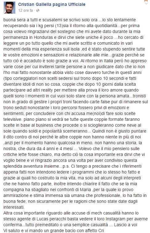 Tramite un post su Facebook, Cristian ammette le colpe di Tara nei confronti di Maria De Filippi ma chiarisce che secondo lui la fidanzata avrebbe agito solo in buona fede. Prima di arrivare al centro del discorso, però, ci tiene a ringraziare tutti per il sostegno e chiarisce che la sua permanenza in Honduras gli è costato un calo di peso incredibile: