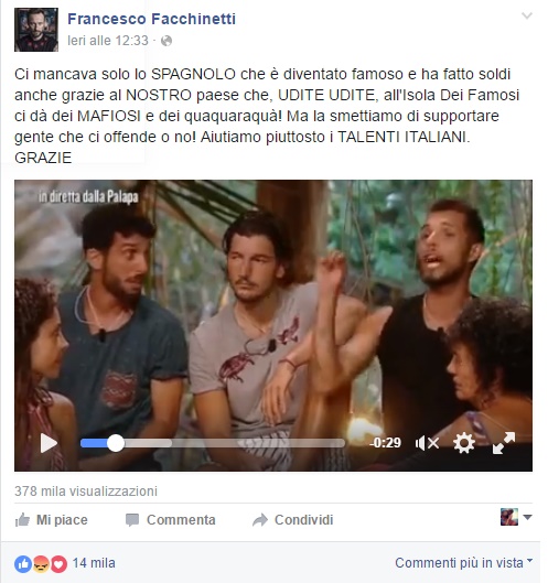 Ci mancava solo lo SPAGNOLO che è diventato famoso e ha fatto soldi anche grazie al NOSTRO paese che, UDITE UDITE, all’Isola Dei Famosi ci dà dei MAFIOSI e dei quaquaraquà! Ma la smettiamo di supportare gente che ci offende o no! Aiutiamo piuttosto i TALENTI ITALIANI. GRAZIE”.
