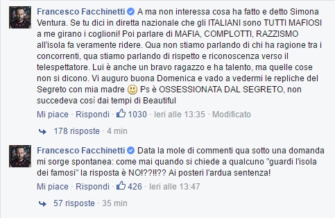 “A ma non interessa cosa ha fatto e detto Simona Ventura. Se tu dici in diretta nazionale che gli ITALIANI sono TUTTI MAFIOSI a me girano i cog**oni! Poi parlare di MAFIA, COMPLOTTI, RAZZISMO all’isola fa veramente ridere. Qua non stiamo parlando di chi ha ragione tra i concorrenti, qua stiamo parlando di rispetto e riconoscenza verso il telespettatore. Lui è anche un bravo ragazzo e ha talento, ma quelle cose non si dicono. Vi auguro buona Domenica e vado a vedermi le repliche del Segreto con mia madre Ps è OSSESSIONATA DAL SEGRETO, non succedeva così dai tempi di Beautiful”.