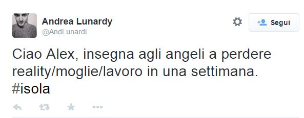 MILANO – Isola, Alex Belli eliminato. Ironia in rete: “Tua moglie ti aspetta col fucile”. Il bel naufrago ha perso al televoto con Valerio Scanu. Quando gli è stato comunicato il risultato dalla conduttrice del reality, Alessia Marcuzzi, lui si è raccomandato a distanza con la moglie Katarina, affinché questa si prepari a fare la spesa in vista del suo ritorno. Belli non sa infatti che c’è la possibilità di rimanere nella nuova Playa desnuda insieme all’altro eliminato, Rocco Siffredi. Intanto la frase di Belli scatena varie ironie sui social. Il motivo è semplice: a sua insaputa, la scorsa settimana, la sua presunta ex amante, Noemi Addabbo, ha rivelato di aver avuto una relazione extraconiugale con l’attore di Cento Vetrine. Ma a quanto pare la resa dei conti è rimandata: Alex decide di rimanere con Rocco sulla Playa Desnuda. A questo punto tutti si chiedono: quale sarà la reazione della moglie di Alex dopo le dichiarazioni della donna? La Addabbo ha infatti affermato a Domenica Live che