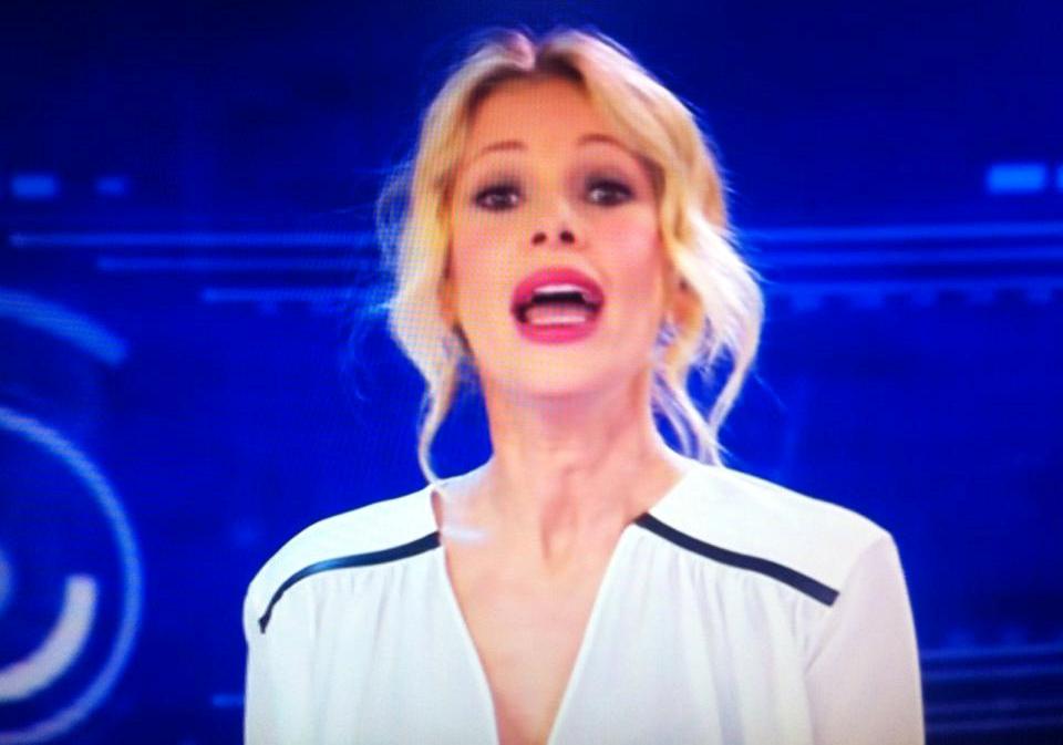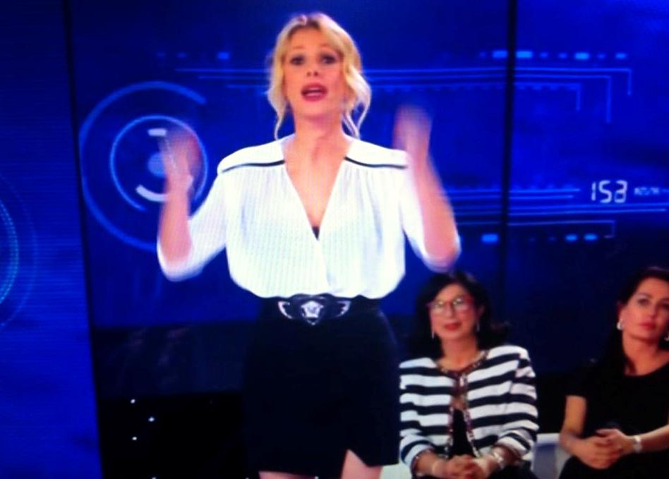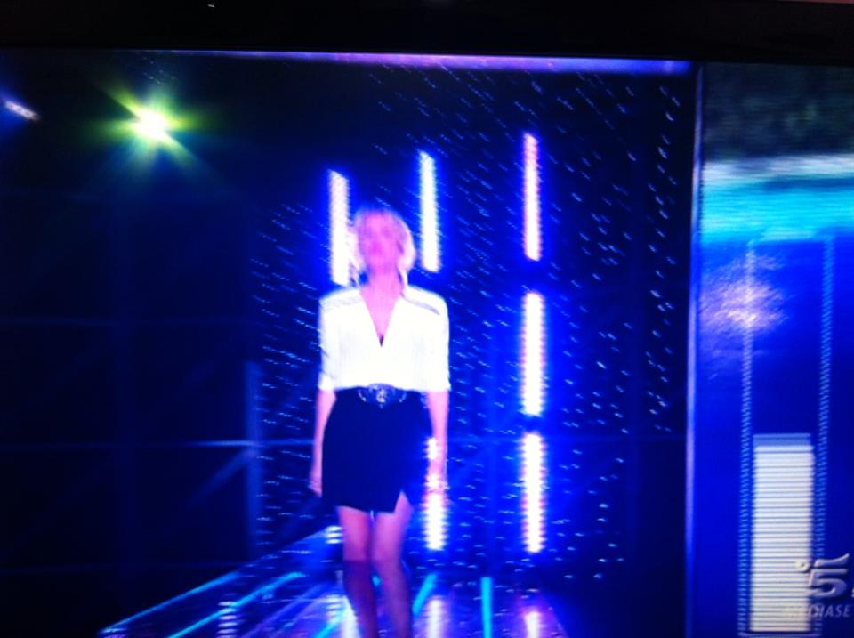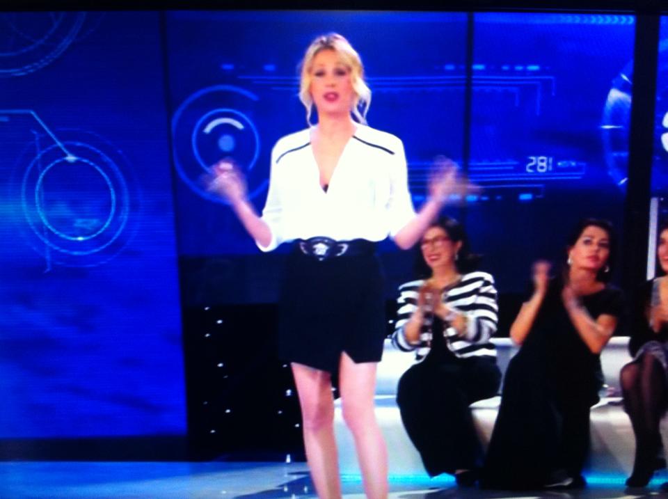 ROMA – Isola dei Famosi, Alessia Marcuzzi: look con gambe in vista. Alessia Marcuzzi sceglie un completo firmato Versace per la terza puntata dell’Isola dei Famosi. Elegante, chic, Alessia Marcuzzi a 41 appare bellissima in questo completo formato da una blusa bianca, una minigonna nera che mette in risalto le lunghe gambe e delle decolté nere con tacchi a spillo.