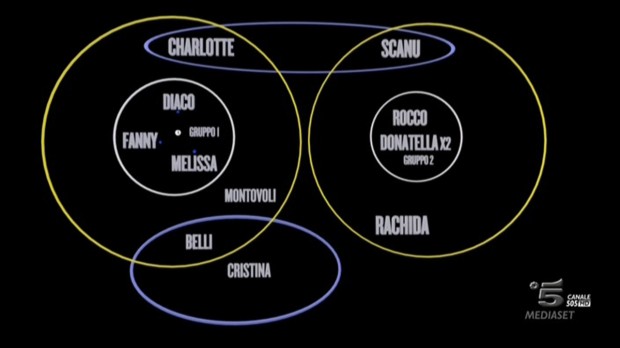Ma andiamo all’isola: questo terzo appuntamento ha fatto emergere le prime strategie di gioco che un improbabile diagramma è stato mostrato dalla produzione di Mediaset. 2 sono le fazioni create, quella composta da Rachida, Rocco Siffredi, le Donatella e Valerio Scanu e quella formata da Andrea Montovoli, Fanny Neguesha, Pierluigi Diaco e Melissa P.. Fuori dai gruppi – ma solo apparentemente – troviamo Alex Belli, Charlotte Caniggia e Cristina Buccino. Secondo molti naufragi Pierluigi Diaco, più falso della scritta “due porzioni” sulla confezione dei surgelati, sarebbe un vero e proprio “manipolatore” di nomination.