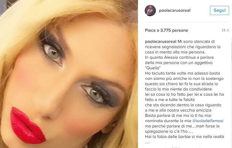 “Mi sono stancata di ricevere segnalazioni che riguardano la casa in merito alla mia persona. In quanto Alessia continua a parlare della mia persona con un aggettivo “Quella”. Ho taciuto tante volte ma adesso basta non siamo più amiche io non la sostengo questo sia chiaro lei fa la sua strada io faccio la mia niente da condividere, lei sa cosa io ho fatto per lei e cosa lei ha fatto a me e tutte le falsità che sta dicendo dentro la casa riguardo a me e alla nostra vecchia amicizia. Basta parlare di me ma io ti ho mai nominata durante la mia Isola dei famosi ma perché parlare di me…mah forse la spiegazione io c’è l’ho….Hai la fobia delle barbie si ma nella realtà….”.