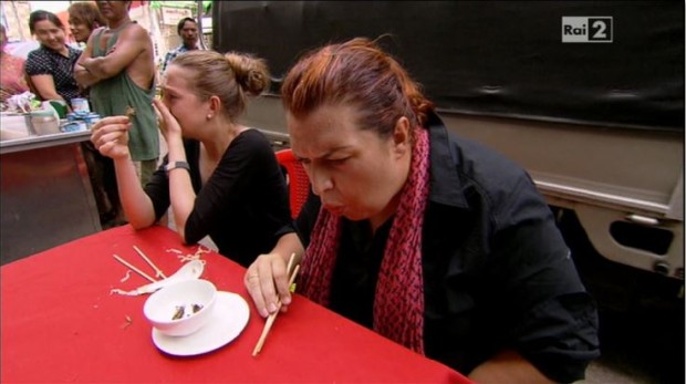 Prima, però, l’ultima missione: i viaggiatori devono mangiare quattro spuntini locali, noodles, zampe di gallina, grilli fritti e (dulcis in fundo) cervello di maiale. E la prova si rivela terribile per tutti, con Eva Grimaldi che alla fine riesce a mangiare le sue portate.